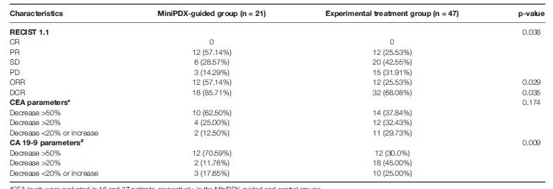 表1:MiniPDX组和对照组RECIST 1.1、CEA和CA19-9各参数