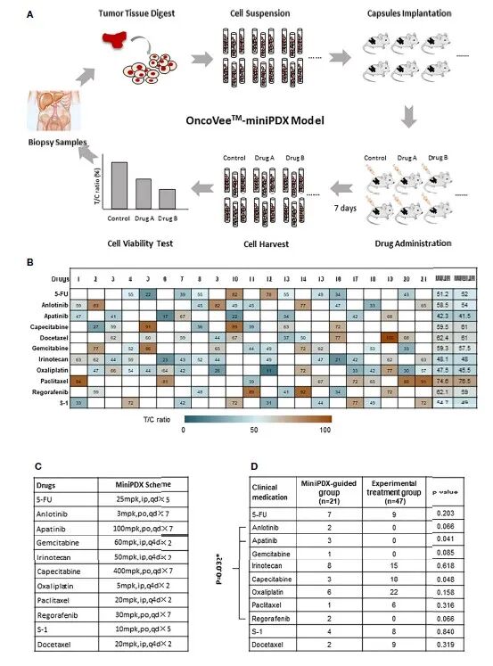该研究共入组68例胃癌肝转移患者,其中观察组21例,使用OncoVee®MiniPDX模型来筛选临床给药的最敏感药物或药物组合方案;47例患者作为对照组,接受NCCN指南用药方案。该研究的主要终点为总生存期(OS),次要终点为客观缓解率(ORR)、疾病控制率(DCR)和无进展生存期(PFS)。临床医生/患者对于MiniPDX结果的依从性为81%(17/21例)。常规治疗组未应用的靶向药物(包括安罗替尼、阿帕替尼和瑞戈非尼)在MiniPDX组被检测出潜在有效并应用于临床中(33.3% vs. 0%, p=0.032)。这一结果可能为后续的疗效获益提供理论依据。