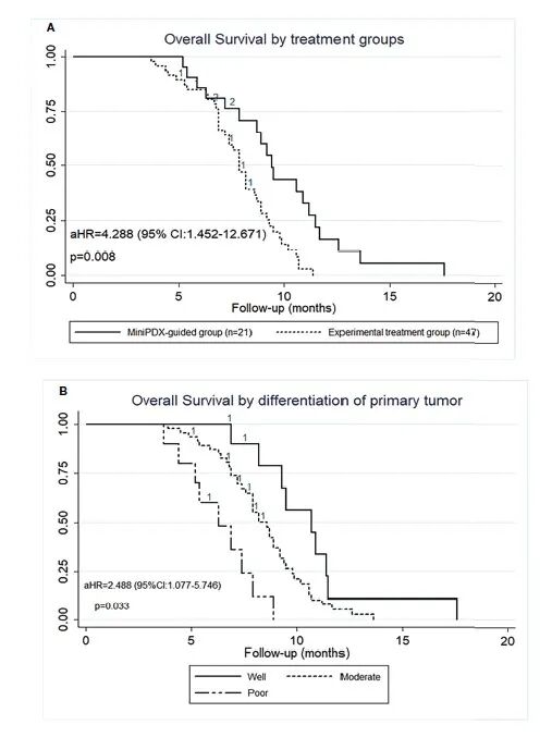 随访结果显示,观察组和对照组的中位OS分别约为9.4个月(95% CI,7.9-11.2)和7.9个月(95% CI,7.2-8.7)。单因素分析(对照组vs. MiniPDX组:HR=2.586,95% CI= 1.362-4.908,p=0.004)和多因素回归分析(对照组vs. MiniPDX组:aHR=4.288,95% CI=1.452-12.671,p=0.008)均显示MiniPDX指导的治疗组,患者OS显著延长。而使用MiniPDX用药方案治疗患者的中位PFS为6.7个月(p=0.032),同样优于使用传统用药方案治疗患者的4.2个月(p=0.029)。此外,MiniPDX组的ORR和DCR均显示高于对照组(ORR:57.14% vs. 25.53%,p=0.029;DCR:85.71% vs. 68.08%,p=0.035)。