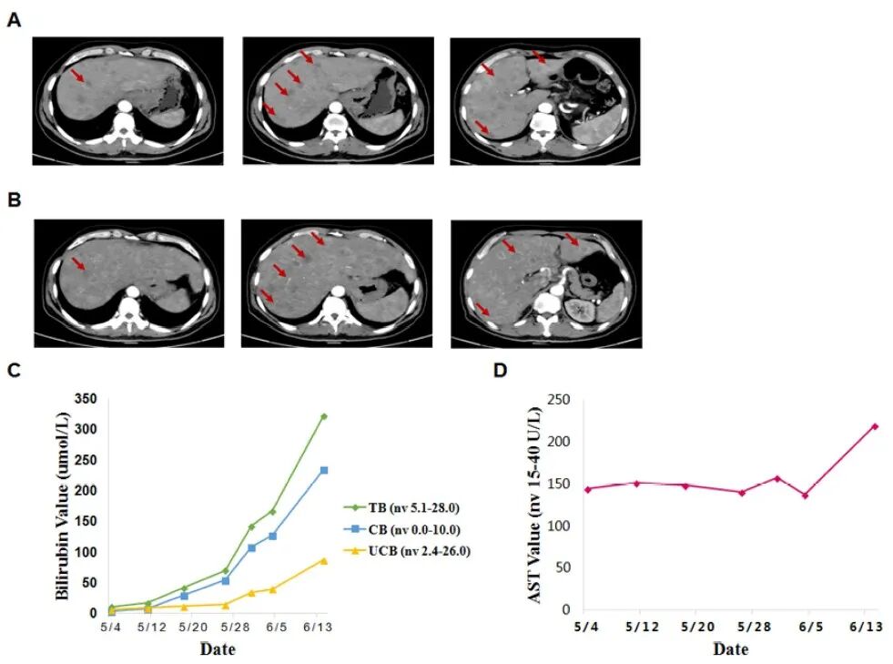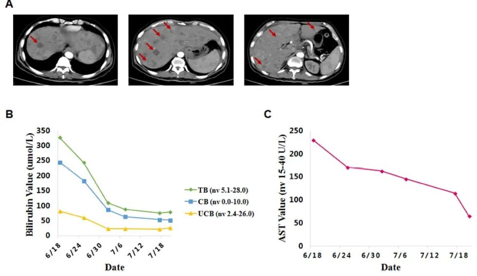 图3. 患者接受治疗后肿瘤消退、肝功能指标改善、症状改善